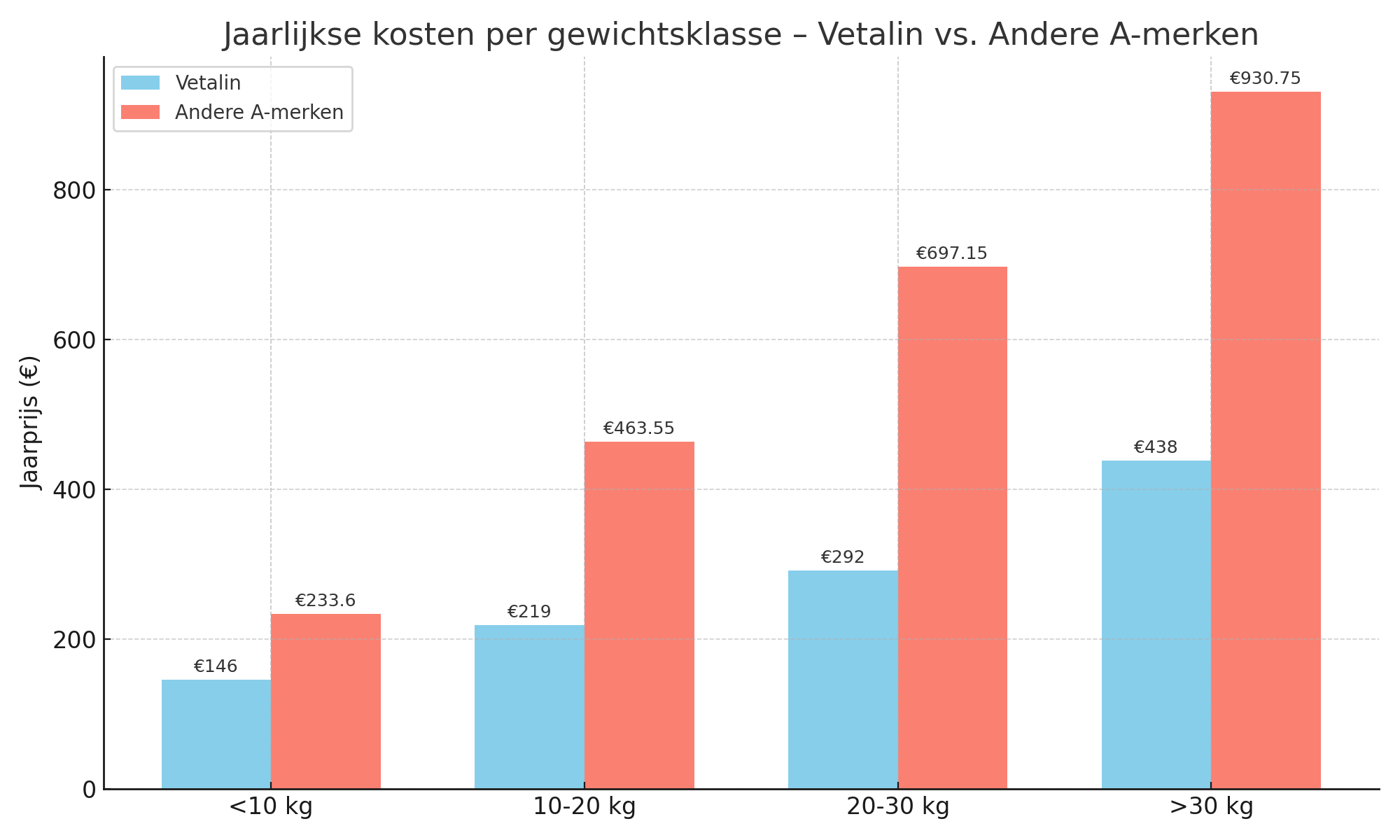 Let op: De genoemde prijsverschillen zijn gebaseerd op de prijs van Vetalin en een selectie van andere A-merken. Deze berekening is exclusief eventuele kortingen, bundelaanbiedingen of tijdelijke acties.